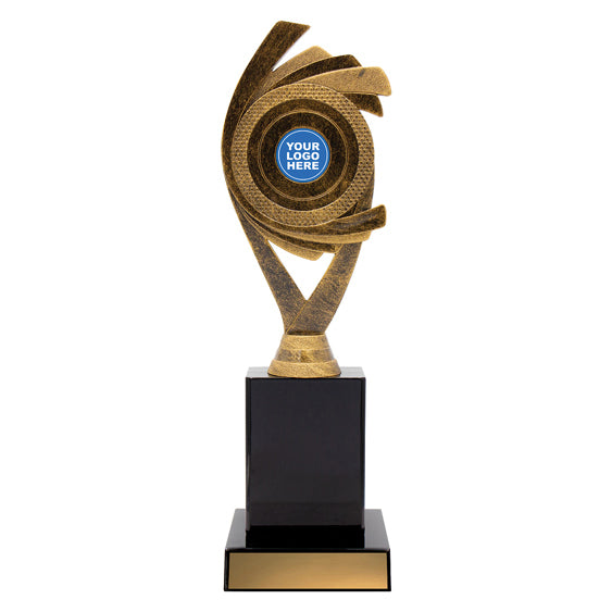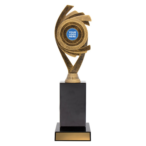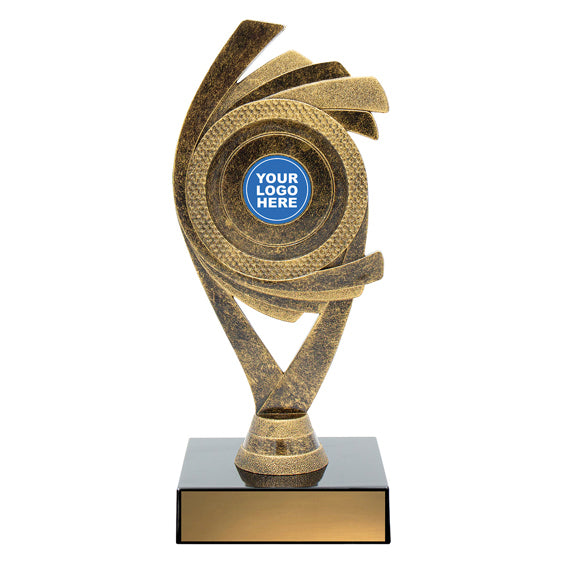 Dynamic design of holder trophies rendered in antique gold colours - Juno showcases your club logo over multiple sizes.