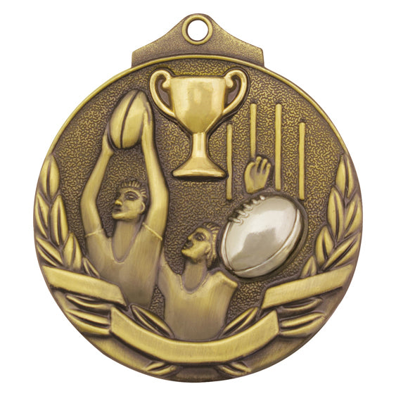 Classic antique medal featuring distinctive two-toned design. Medal a fantastic option to recognise the achievement of your footy team or club. Ribbons available in all colours and medal boxes to suit.