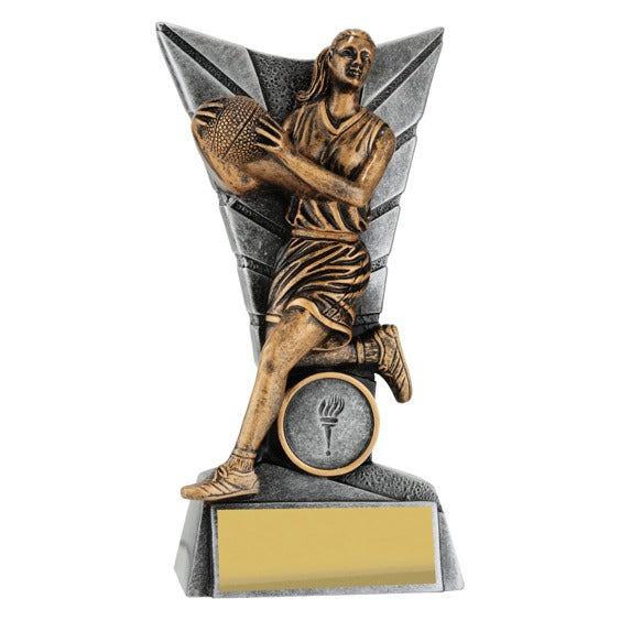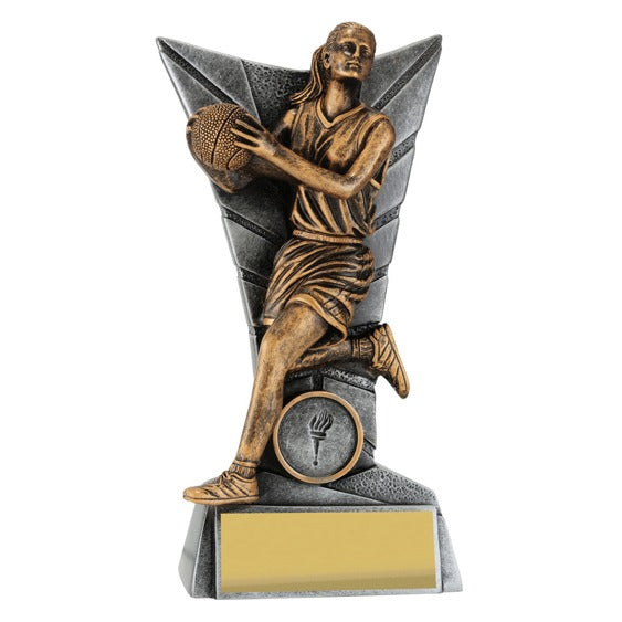 Elegant silver backdrop for this trophy series frames the detailed player captured in action. Basketball trophies available in male and female and in 3 sizes to suit your award needs. Excellent choice for best player trophies for your team or club. A - 150mm, B - 170mm, C - 190mm