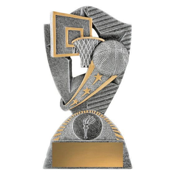 Brilliant basketball trophy for your team or club. The Gambit offers a dynamic theme in antique silver & gold – space for your custom logo. Available in 3 sizes...A - 120mm, B - 140mm, C - 155mm