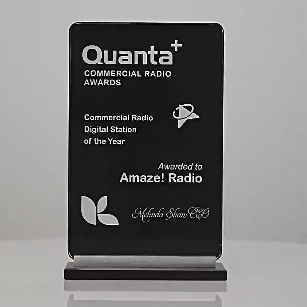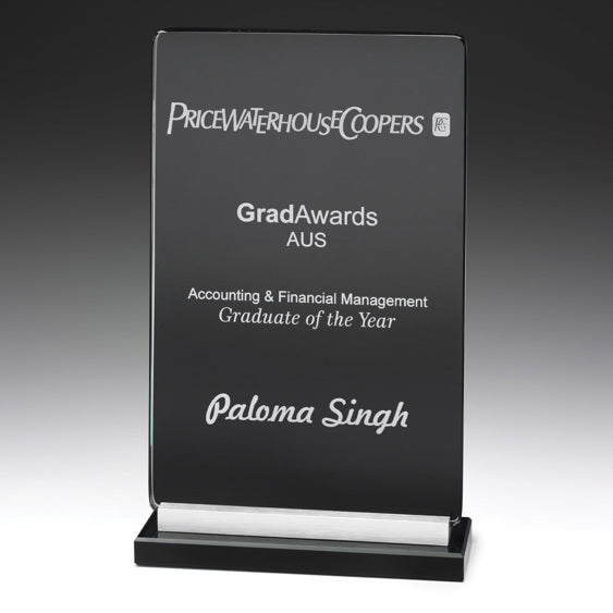 With an imposing design, the Glass Black Broadside is sure to make a bold statement at your awards event. The black panel element in the design of the award elevates the quality of engraving. The brushed metal base element adds to the appeal of the design. Supplied in Gift Box.