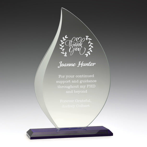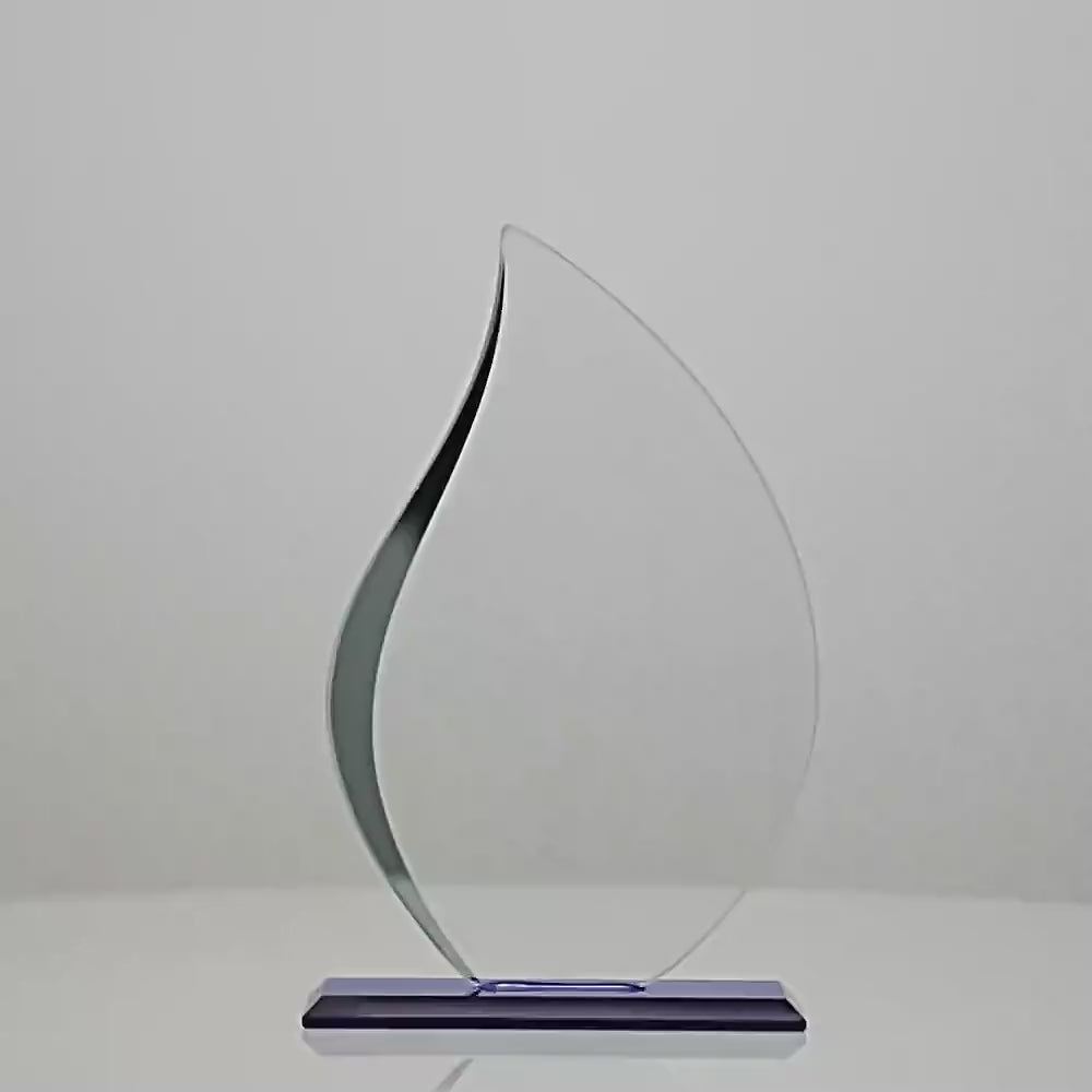 5mm thick Glass ‘Blue Lotus’ Series . The black offset design allows for clear & crisp engraving definition. Silver mirror highlights makes this trophy award stand-out. Available in 3 sizes 170, 190 & 210mm – supplied in gift box.
