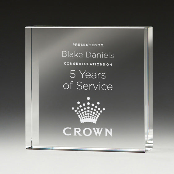 Bold Crystal Award offering broad scope for personalisation. The design of the Vault keeps it simple so your message of recognition will justly stand out as a consequence. 2 Sizes 100 x100 x30 and 150 x 150 x30