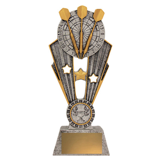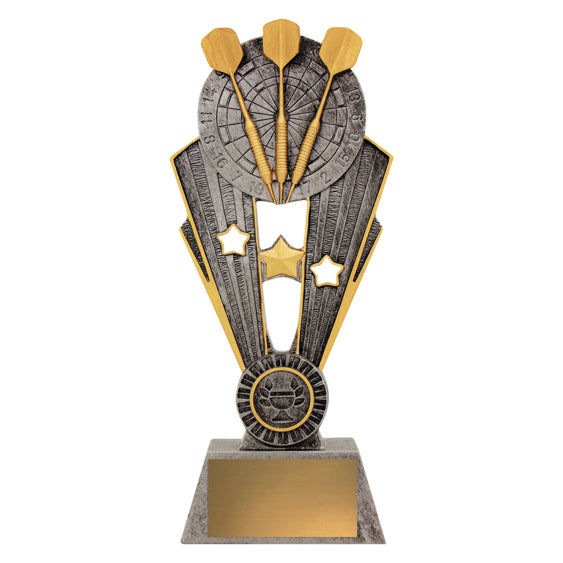 Classic Darts trophy series featuring the iconic darts on board design, finished in traditional silver and gold colours. C - 250mm, B - 220mm, A - 200mm
