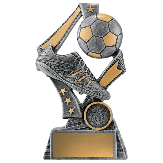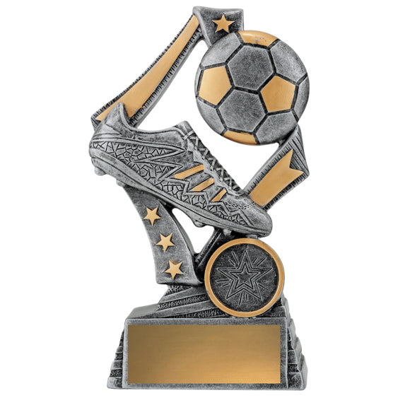 Dynamic football trophies perfect for the players both boys and girls at your club. These ‘Flag’ Football trophies feature a stylish star based design with iconic boot and ball elements available in 3 sizes. C - 175mm, B - 155mm, A - 135mm