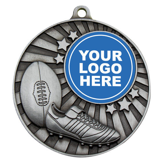 Brilliant footy medals features iconic elements of boot and ball while retaining central space for your custom logo to celebrate your club.