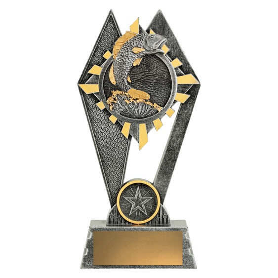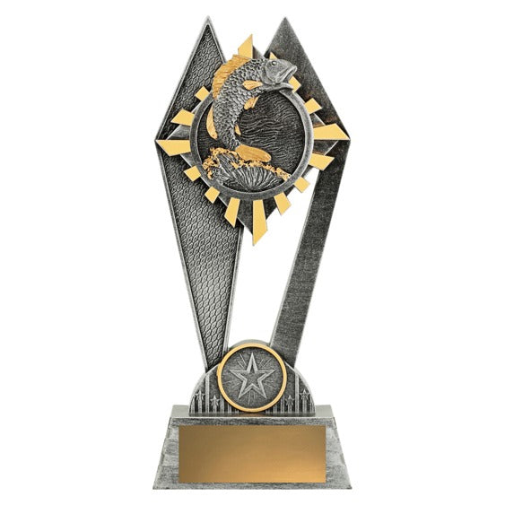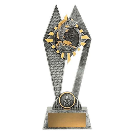 Peak style trophies – for Fishing – offer fantastic value for bigger series of trophies available in 3 sizes. Design showcases key elements for Fishing against vibrant sunray background. A - 180mm, B - 200mm, C - 225mm