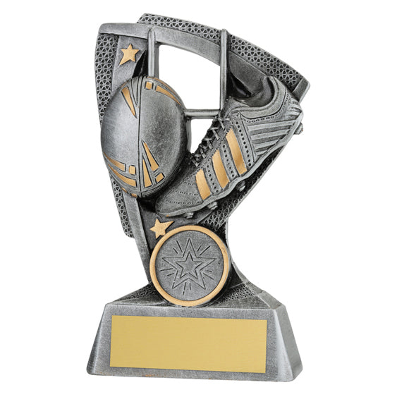 Rugby League & Union shield & star inspired design frames the iconic boot and ball combination. Space for 25mm insert if required. B - 140mm, A - 120mm