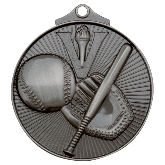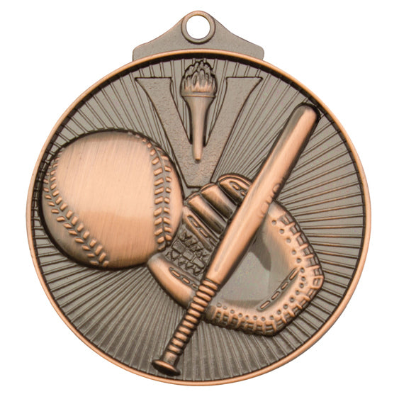Antique gold, silver and bronze medals for Baseball or Softball. A classic design, the Sunraysia Medal series feature classic elements - ball, glove and bat. Medals feature an extra thick edge and a rectangle panel on the back of the medal for your engraving.